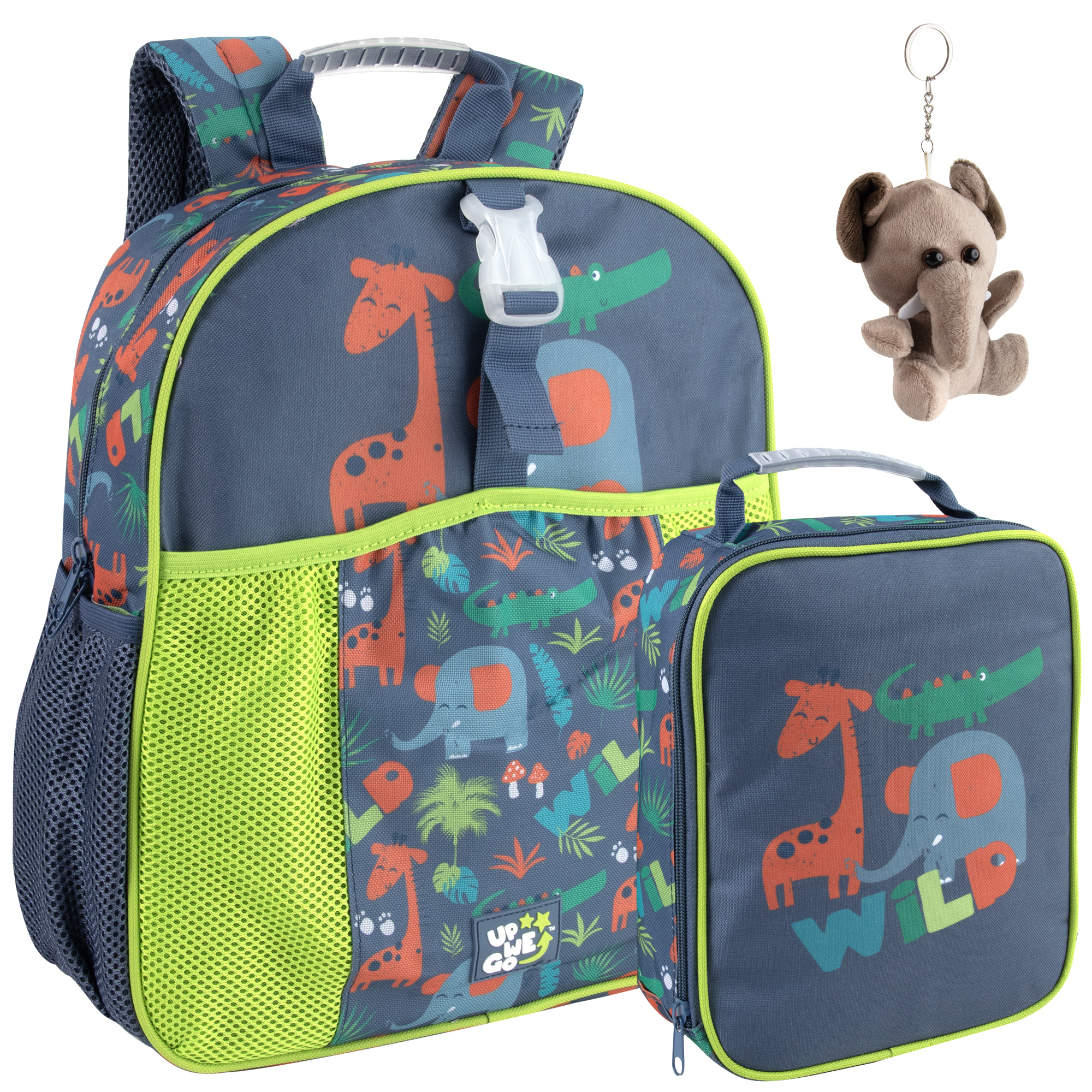 Jungle 3pc set with backpack, lunch bag and key chain. Air mesh pockets and underside straps, reflective strips for added safety, all over printed back, covered grip top handleSpecifications
