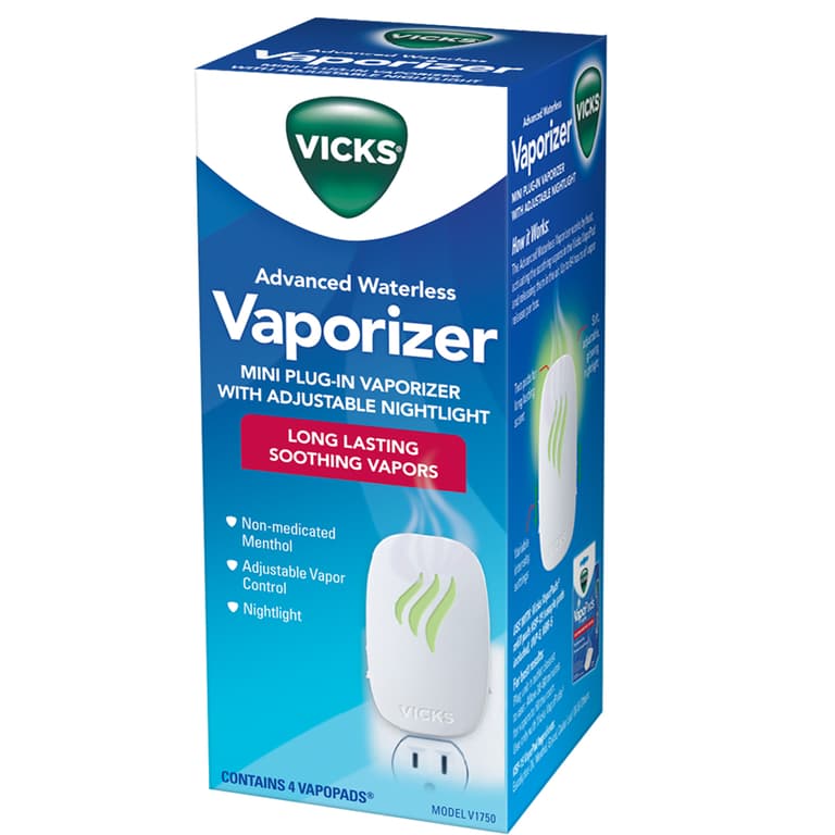Vicks Plug-In Waterless Vaporizer with Nightlight. The Vicks Soothing Vapors Plug-in Waterless Vaporizer releases soothing Vicks Vapors.Specifications
