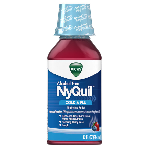Vicks NyQuil, Nighttime Cold & Flu Medicine, Relieves Aches, Headache, Fever, Sore Throat, Nasal Congestion, Sneezing, Runny Nose, Cough, Alcohol Free, 12 Fl OZ, Berry Flavor.When you have a cold, turn to Vicks NyQuil Cold & Flu Nighttime Relief. The nighttime, sniffling, sneezing, coughing, aching, fever, best sleep with a cold, medicine. Powerful Cold and Flu Relief. Temporarily relieves common cold and flu symptoms including cough due to minor throat and bronchial irritation, sore throat, headache, minor aches and pains, fever, runny nose and sneezingSpecifications