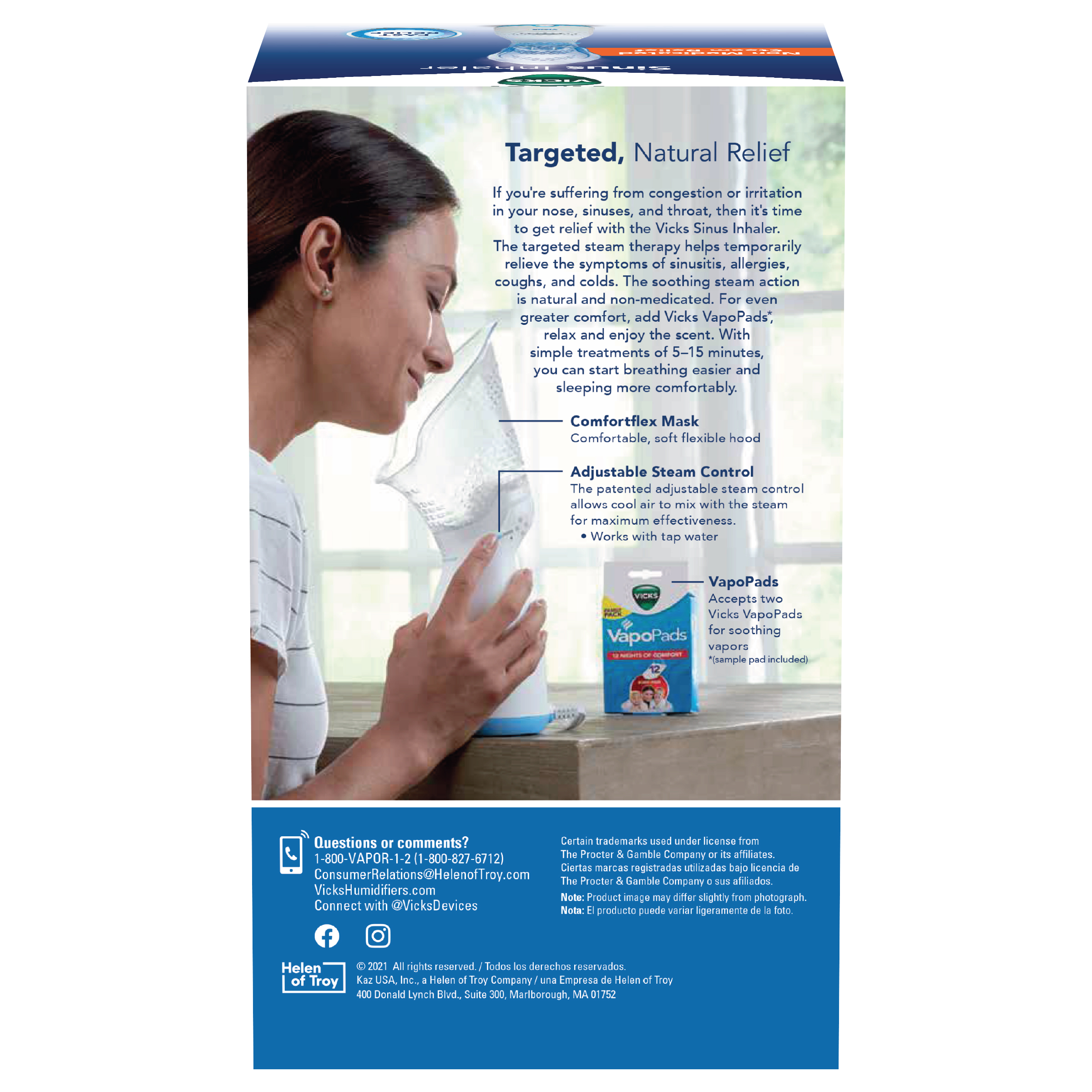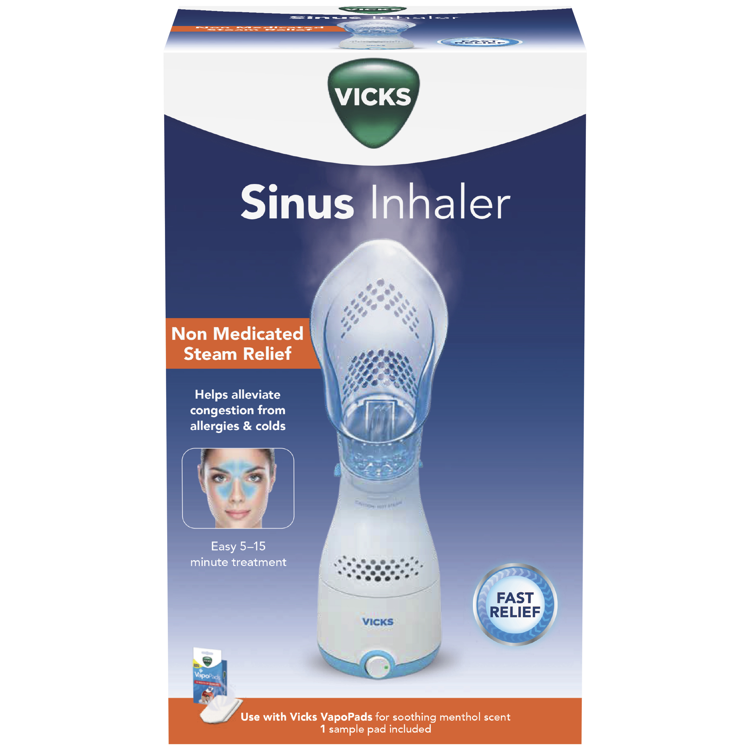 Use the Vicks Personal Steam Inhaler for cold, flu, bronchitis, sinusitis, laryngitis, and allergy sufferers, this personal steam inhaler restores sufficient moisture to the lungs. The patented plastic hood on the Vicks Personal Steam Inhaler is contoured to cradle the face comfortably and directs warm moist air right into the nose and throat to temporarily relieve nasal, sinus, and chest congestion. Water goes into the easy-to-fill base where a patented heater gently boils it. The adjustable control on the Vicks Personal Steam Inhaler lets you choose the amount of steam that rises up into the hood. A short 5 to 15 minute treatment is all that is required to make nasal and throat passages feel clearer. Small Convenient size, perfect for home use or travel Adjustable steam output for just the right amount of steam Quickly boils the water for fast relief Soft hood for personal comfort. VICKS STEAM INHALER: Vicks Personal Steam Inhaler, with a soft, comfortable face mask and compatible with soothing menthol Vicks VapoPads, provide a warm mist of steam for temporary relief from allergies, congestion and coughs in a 5-15 minute treatment.PERSONAL STEAM INHALER: Many find that using a steam inhaler for sinus relief or other breathing problems, such as bronchitis, allergies, and colds, helps them breathe more easily. Vicks inhaler features a face mask, for targeted delivery of pure mist.COUGH AND CONGESTION RELIEF: When you have a cold, coughing and congestion can make you miserable. Vicks personal steam inhaler provides temporary relief from coughing and congestion, so you get a rest from coughing fits and can breathe more freely.VICKS VAPORIZERS, HUMIDIFIERS, & STEAM INHALERS: Moisture & humidity offer temporary relief from cough & congestion due to colds or allergies. Vicks line of humidifiers & steam inhalers, help you breathe easier wherever you are, from the bedroom to the office.VICKS PERSONAL STEAM INHALER: Our personal steam inhaler helps you breathe easier wherever you are.Specifications