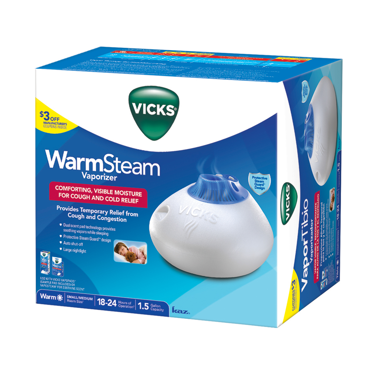 The Vicks Warm Steam Vaporizer with protective Steam Guard design provides maximum performance and reliability. The vaporizer boils the water and produces vapor which is released into the room. Steam vapor helps temporarily relieve cough and congestion. The vaporizer will automatically shut off when the water reaches minimum level.The tank is made from 100% recycled content.Specifications