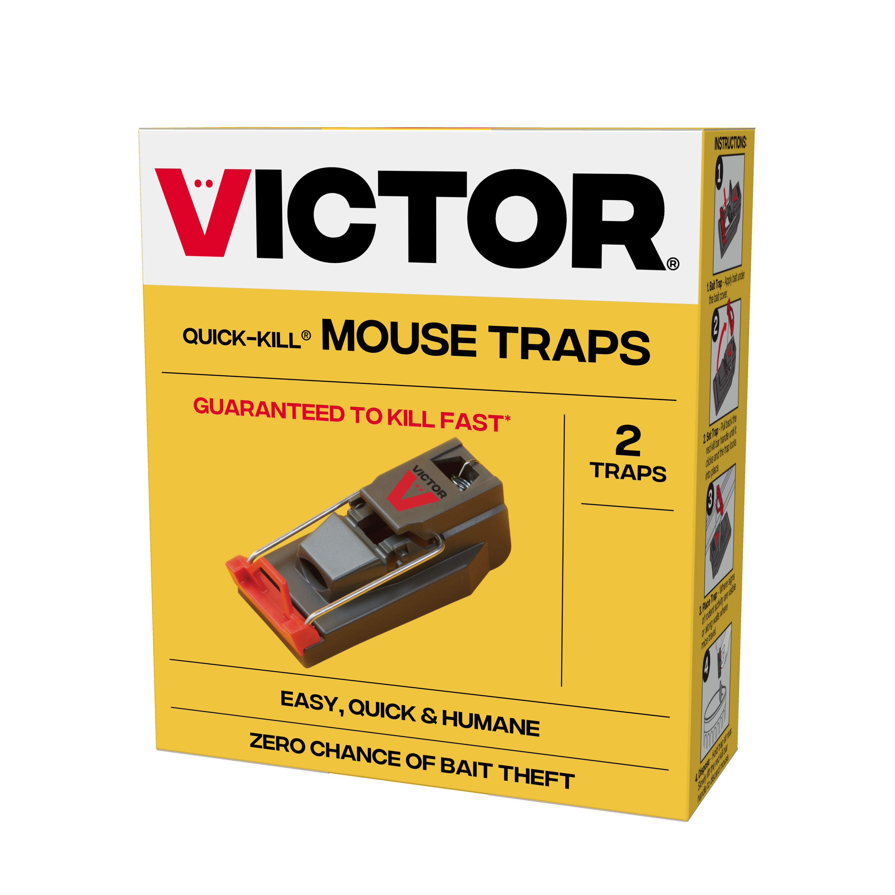 Have a mice problem, and just can’t seem to get rid of them? The Victor Quick-Kill Mouse Trap is easy-to-use and is proven highly effective. The trap provides a covered bait trough, eliminating bait theft. With its Precision Strike Technology, the mouse lifts the bait cover, triggering the kill bar immediately and ensuring a quick, humane kill. Setting the trap is as easy as pulling back the kill bar until it clicks into place. When the mouse is killed, open the release mechanism and dispose of the rodent, ensuring a no-touch removal. The trap can be used anywhere indoors or out. It contains no chemicals or poison, making it an ideal choice for homes with children or pets.Specifications