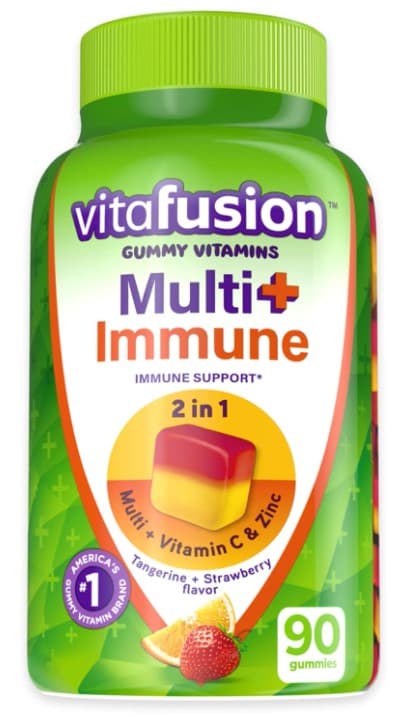 2-in-1 fusion of benefits & natural flavorsAdult gummy vitamins with daily multivitamin PLUS immune support with Vitamin C & Zinc 90 count.New from America's #1 Gummy Vitamin Brand, VitaFusion Multi + Immune Support gummies are multivitamin gummies with 2-in-1 benefits and natural flavors! Each 2-gummy vitamin serving combines a daily multivitamin PLUS immune support with Zinc and Vitamin C. You’ll love the fusion of delicious and nutritious, featuring great-tasting tangerine and strawberry flavor.Convenient & Easy: Tired of taking multiple vitamins and supplements for your unique health needs? These convenient new 2-in-1 gummies are an easy way to simplify your daily vitamin regimen.2-in-1 Benefits & Flavors: Enjoy a fusion of nutritious and delicious with tangerine and strawberry flavor and multivitamin plus immune support.Daily Multivitamin: Delicious gummy multivitamin for adults to help support your everyday health needs including Vitamin D, Vitamin A, B-Vitamins, Vitamin E, and minerals.Daily Immune Support: These daily gummies contain Zinc and Vitamin C to provide immune support.Delicious & Nutritious: Great-tasting, 2-in-1 vitamin gummies are a tasty alternative to traditional vitamin pills and vitamin capsules that are hard to swallow. Each bottle contains 90 gummies for a 45-day supply of delicious and nutritious.What’s NOT in our gummies: Gummy adult vitamins made with NO artificial flavors or sweeteners. Contains natural flavors, NO gluten, NO high fructose corn syrup, NO dairy, and NO synthetic FD&C dyes.Specifications