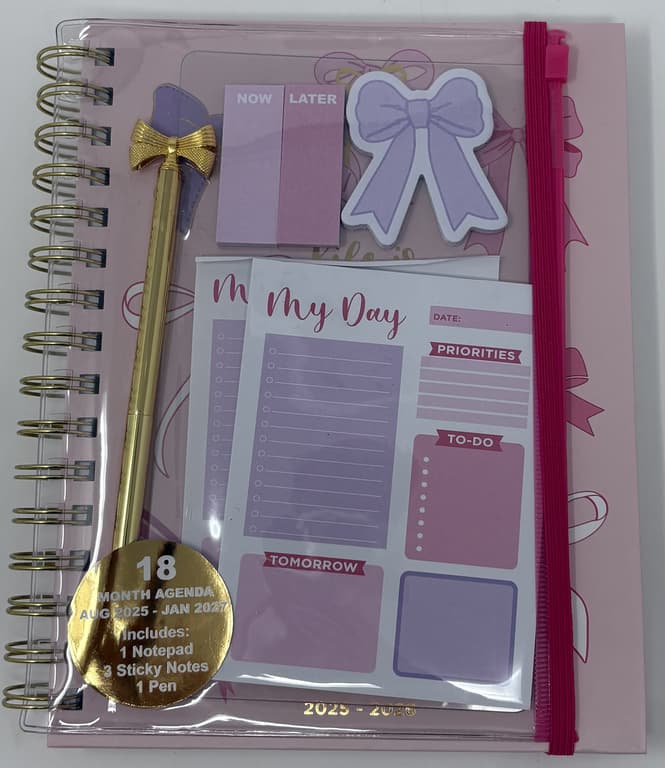 This planner keeps you organized for 18 months. Post it Notes, a pencil poch and a pen are all included. This has a lovely bow print on the frontSpecifications
