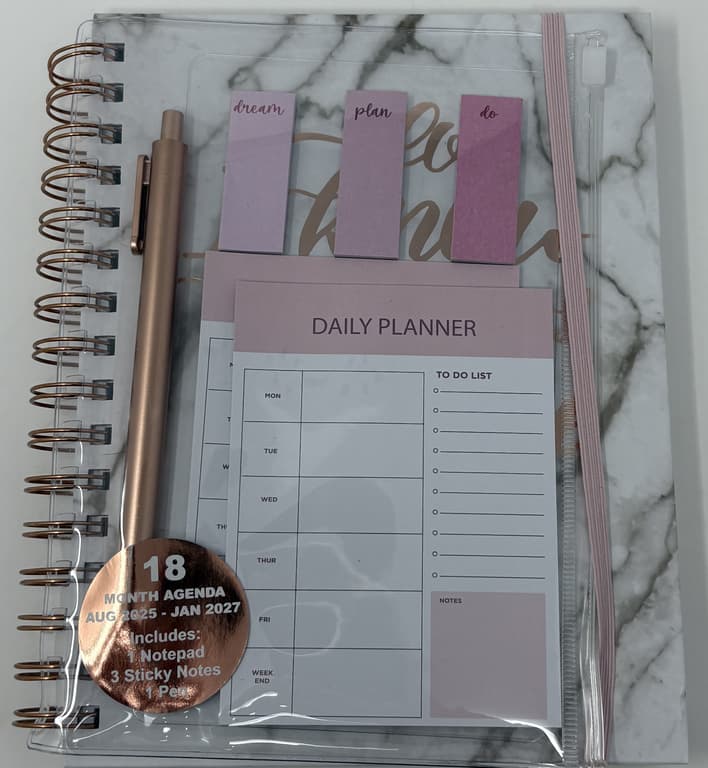This planner keeps you organized for 18 months. Post it Notes, a pencil poch and a pen are all included. This has a lovely marble print on the frontSpecifications
