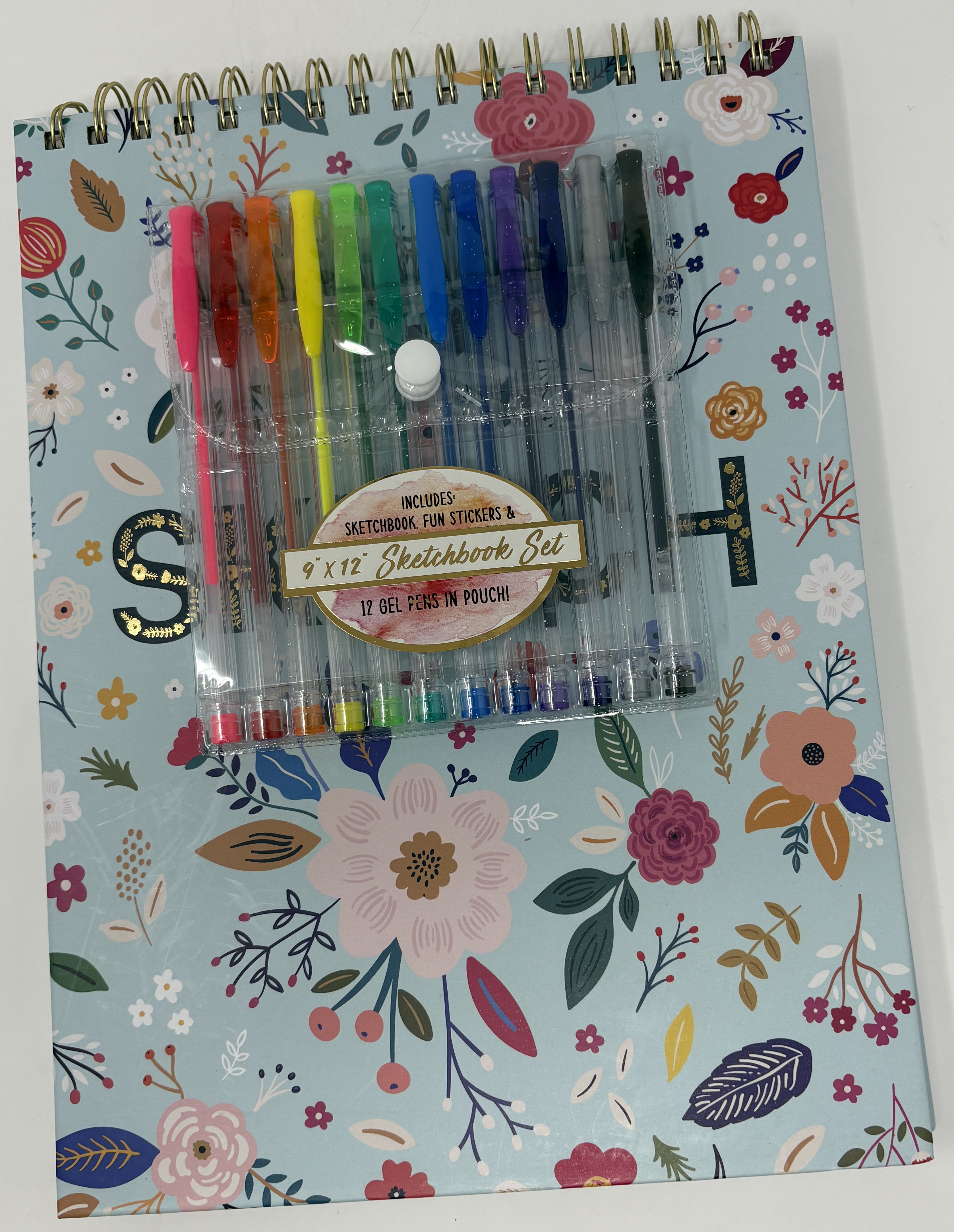 12 Gel Pens; Blue Bouquet; Large Sketchbook; Sticker Sheet