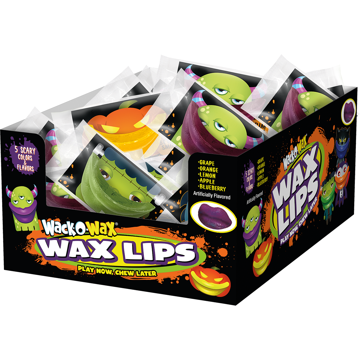 5 COLORS; FLAVORS INCLUDE GAPE, LEMON, ORANGE, APPLE, BLUEBERRY; INDIVIDUALLY WRAPPED; WAX LIPS