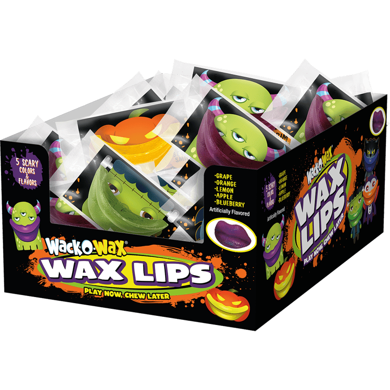 WACK-O-WAX CANDY FANGS COMES IN FIVE FRUITY FLAVORS INCLUDING GAPE,LEMON, ORANGE, APPLE AND BLUEBERRY THESE ARE IDEAL FOR ANY HALLOWEEN CELEBRATION.Specifications