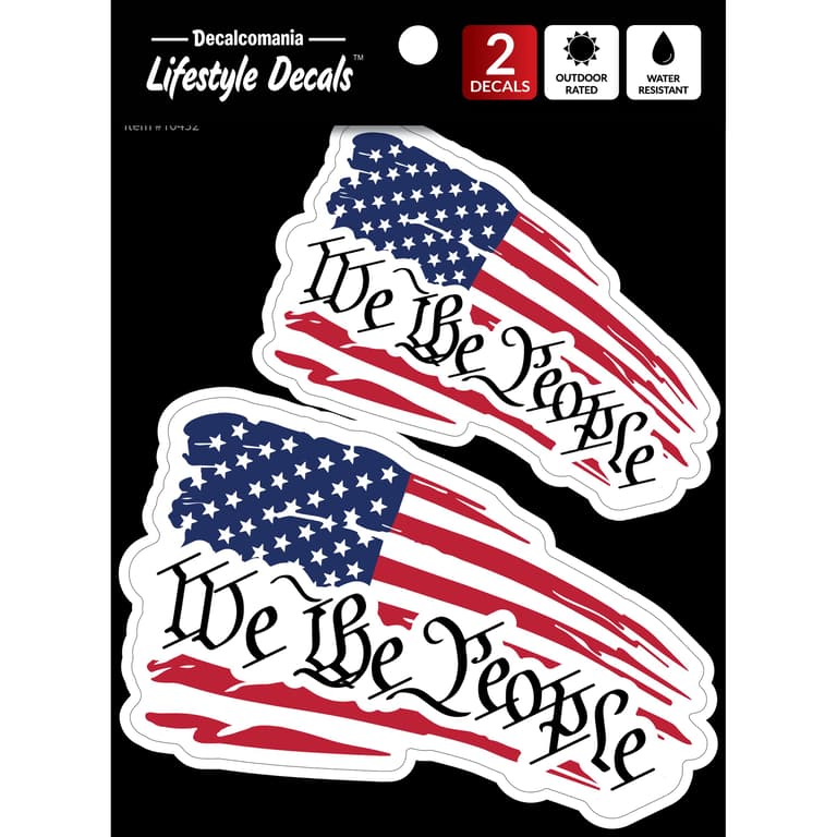 Celebrate American pride and the power of the Constitution with these "We The People" flag decals. This set includes two high-quality decals featuring a beautifully distressed American flag design paired with the iconic "We The People" script, a tribute to the opening words of the U.S. Constitution.Perfect for vehicles, laptops, or any smooth surface, these decals are crafted from outdoor-rated, water-resistant materials to ensure long-lasting durability and vibrant colors, rain or shine.Specifications