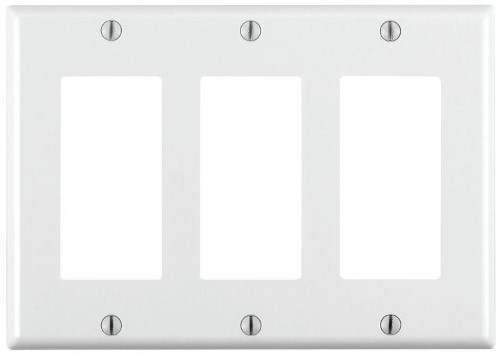 3-decora rocker wallplate; 3-gang; Includes metal mounting screws that match plate color; Made of thermoset plastic; Meets all UL514 requirements.; Residential grade; Resist dust accumulation with Decoras smooth face & rounded edges; Standard size; White
