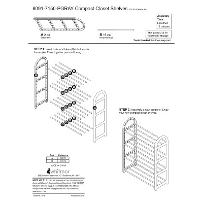 Alleviate cramped closet with Whitmers portable closet shelves; Dimensions: 7.25 in. x 19.50 in. x 25.25 in.; Durable resin side frame with chrome plated tubes 4-tiers of versatile storage space; Whitmers 4-tier closet shelves fits great in the closet under hanging clothes; Whitmors easy no tools required rack looks great and adds function to almost any space