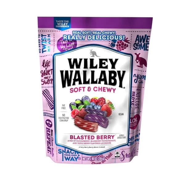 Wiley Wallaby Gourmet Blasted Berry Licorice is so soft and chewy, so bursting with terrific taste, you need look no further for the satisfaction you crave.We packed it so full of fresh fruit flavor, there was less room for the things you could do without. Less sugar, fat free and absolutely no dairy or high fructose corn syrup makes Wiley Wallaby the candy your conscience feels better about, too. Win-win-win!Specifications
