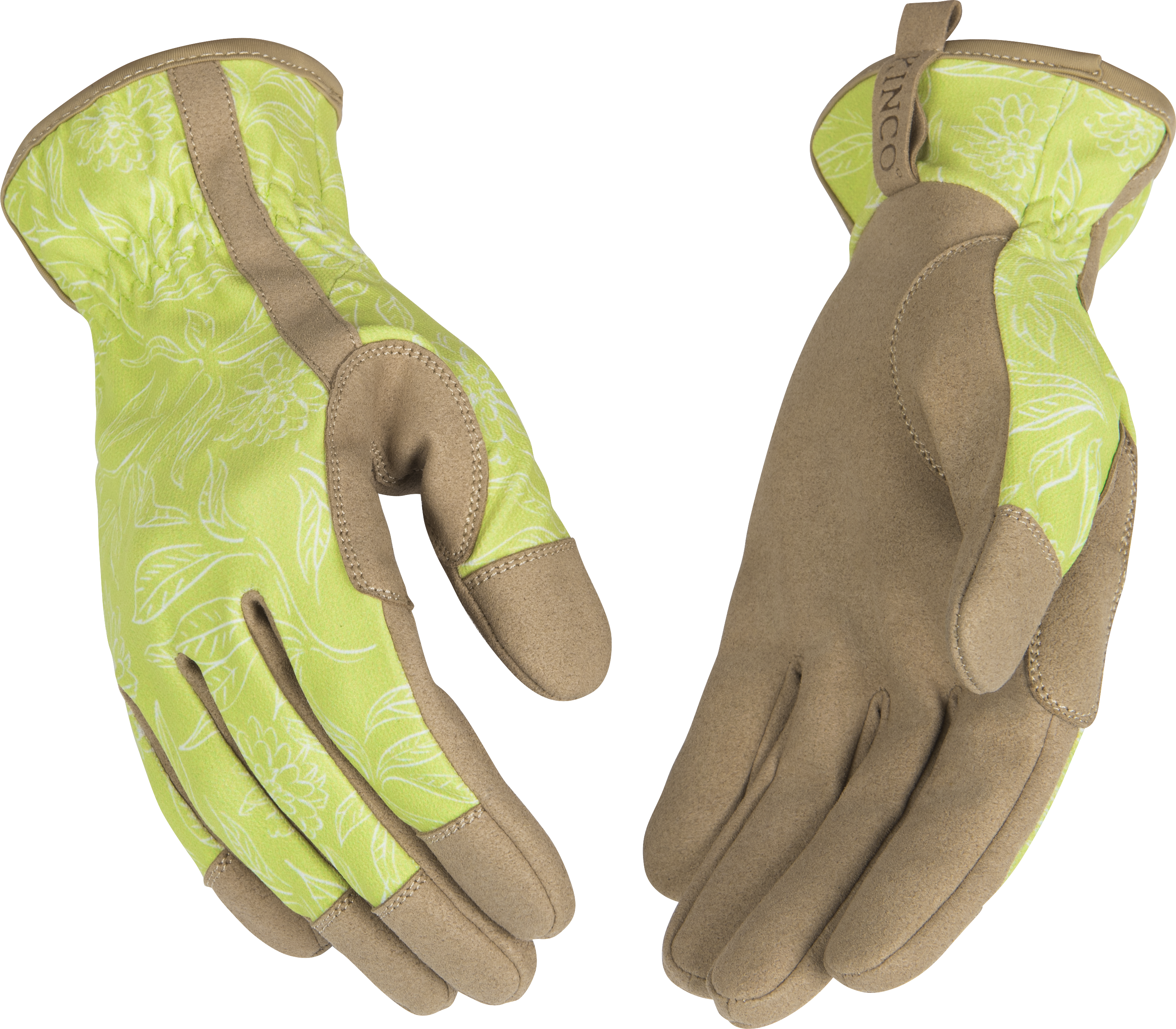Women's KincoPro Lime Green Print Polyester-Spandex Fabric Back, Tan MiraX2 Suede Synthetic Leather Palm, Easy-On Cuff with Shirred Elastic Wrist, MiraX2 Suede Synthetic Leather Reinforcement Patch on Thumb, Inset Wing Thumb Design, MediumSpecifications