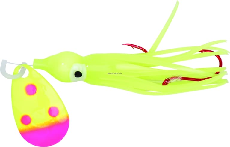 Pre snelled kokanee trolling rig. UV coated Indiana style hammered blade. Genuine "Yamashita" 1-1/2" squid body. Pre-snelled fluorocarbon 10 pound test leader. Two fish attracting red hooks.Specifications