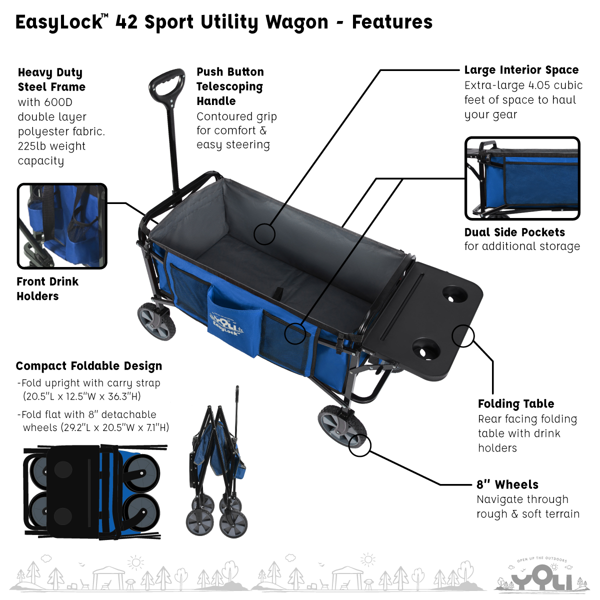 (WE CANNOT GUARANTEE A SPECIFIC COLOR) If you'd like us to choose for you, we are more than happy to do so. If not,please visit us in store to pick your favorite color. Open Up the Outdoors with YOLI's patented EasyLock 42 Sport Utility Folding Wagon. Easily transport gear for family outings, gardening tools, sports equipment for the big game or construction materials to the job site. Extra-large basket with 4.05 cubic feet of space with a best-in-class 225lb weight capacity. Constructed from a heavy-duty powder coated steel frame with a 600D polyester fabric for long lasting use. Fast set up; unfold the frame, push down in the middle of the wagon and attach the wheels. Folding is even faster with our patented foot push design...no bending, no straining. Step down on the front bottom frame rail and tilt towards you, the wagon folds onto itself. Easy to navigate with the push-button telescoping handle with contoured grip for comfort. The EasyLock 42 Sport Utility Wagon features a large mesh pocket on one side, 2 small mesh pockets on the other side, 2 drink holders in the front and a rear facing folding table with two drink holders. Detach the 8" wheels for a compact, fold flat design that easily fits in most car trunks. 1-Year Limited Warranty.Specifications