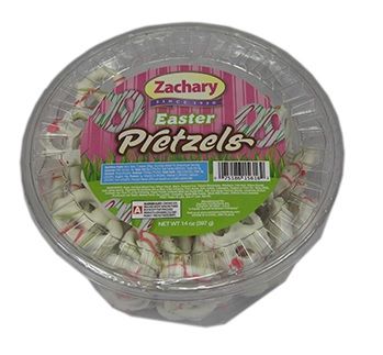 ZACHARY PRETZEL TUBS ARE YOGURT COVERED PRETZELS WITH GREEN AND RED DRIZZLE ON THEM. THIS IS THE PERFECT SNACK TO ADD TO YOUR CANDY DISHES THIS EASTER.Specifications