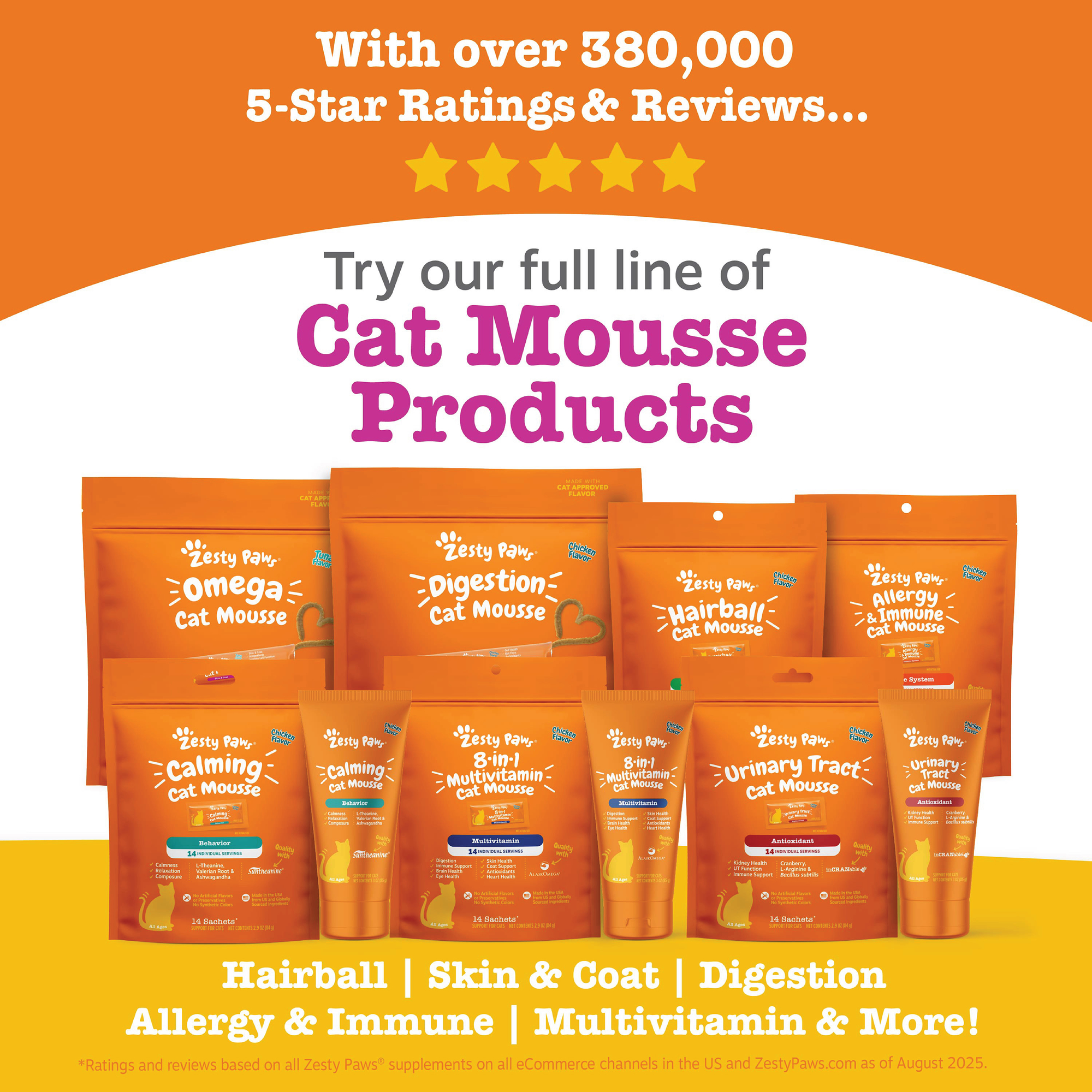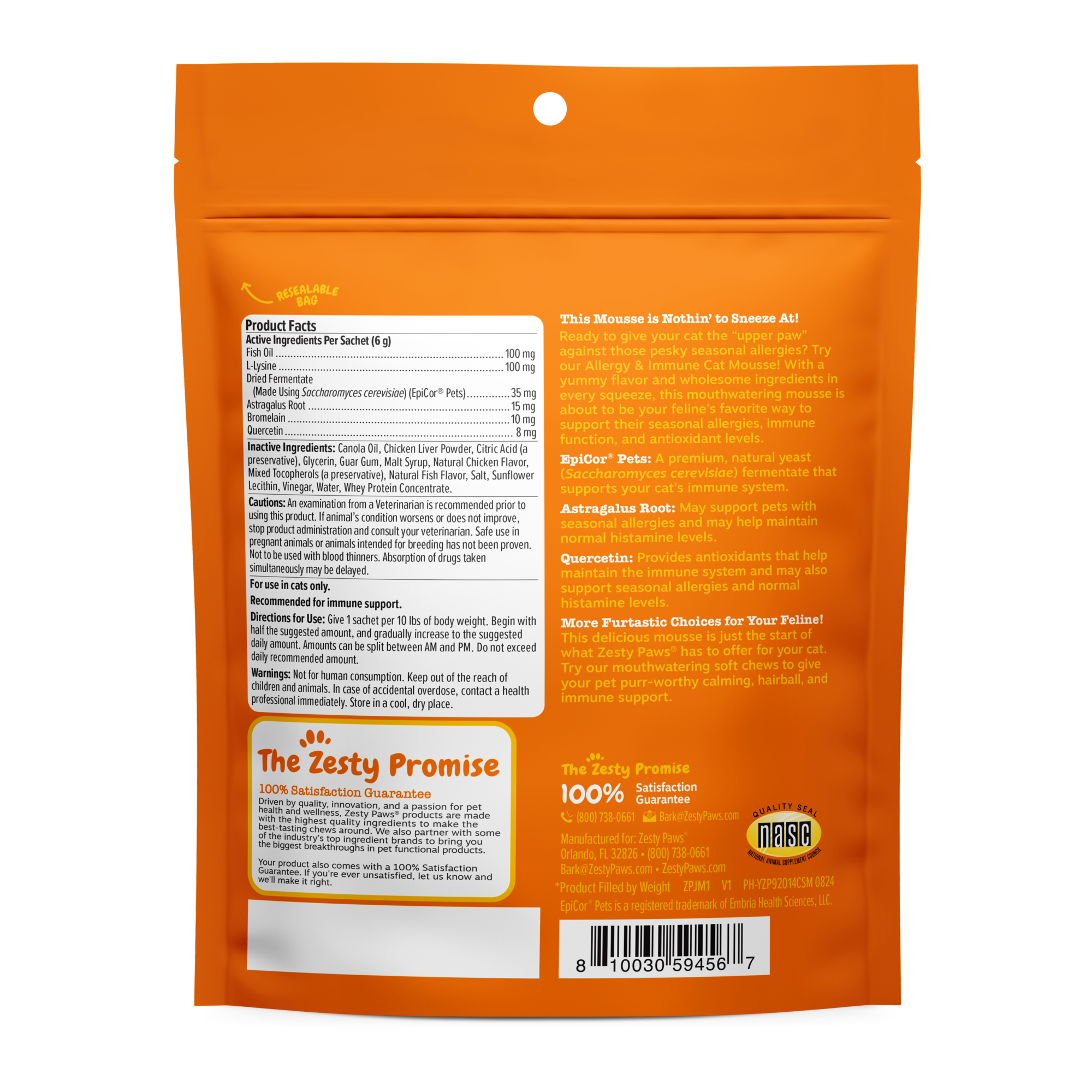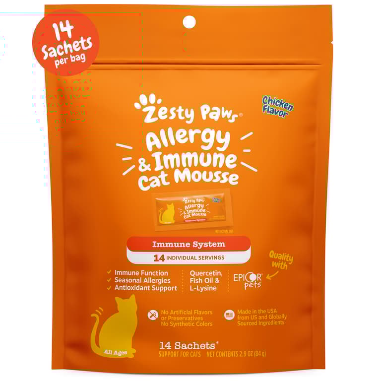 Cats love living their best lives! But sometimes, conquering their seasonal allergies is no small feat. So, it's only natural that loving pet parents like you look for supplements to help your feline fave feel super good again! If you are ready to give your cat the "upper paw" against those pesky seasonal allergies, try Allergy & Immune Cat Mousse and prepare to let out a sigh of sweet relief! Every squeeze of this delicious mousse includes EpiCor Pets, Fish Oil (for omega fatty acid support), Quercetin, Lysine, Astragalus Root, and Bromelain. Together, these wholesome ingredients support their seasonal allergies, immune system function, skin health, and antioxidant levels.Every squeeze of this delicious mousse includes EpiCor Pets, Fish Oil (for omega fatty acid support), Quercetin, Lysine, Astragalus Root, and Bromelain. Together, these wholesome ingredients support their seasonal allergies, immune system function, skin health, and antioxidant levels.Specifications