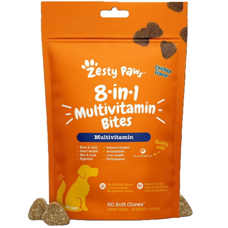 Finding great multivitamin support that can help care for your dog can be a real pain. But, Zesty Paws is here to make finding pawsome multivitamin products easy! 8-in-1 Multivitamin Bites are nutritional supplements that support hips and joints, heart health, skin and coat, digestion, the immune system, antioxidant activity, liver health, and performance for adult and senior dogs. Best of all, these bite-sized doggie chewables taste delicious (trust us, we have a hot spot where official four-legged testers tell us) that’ll give pets an itch for more, and pet parents can let out a sigh of daily relief knowing that their canine companion will get multivitamins to keep them feeling Zesty and happy!Specifications