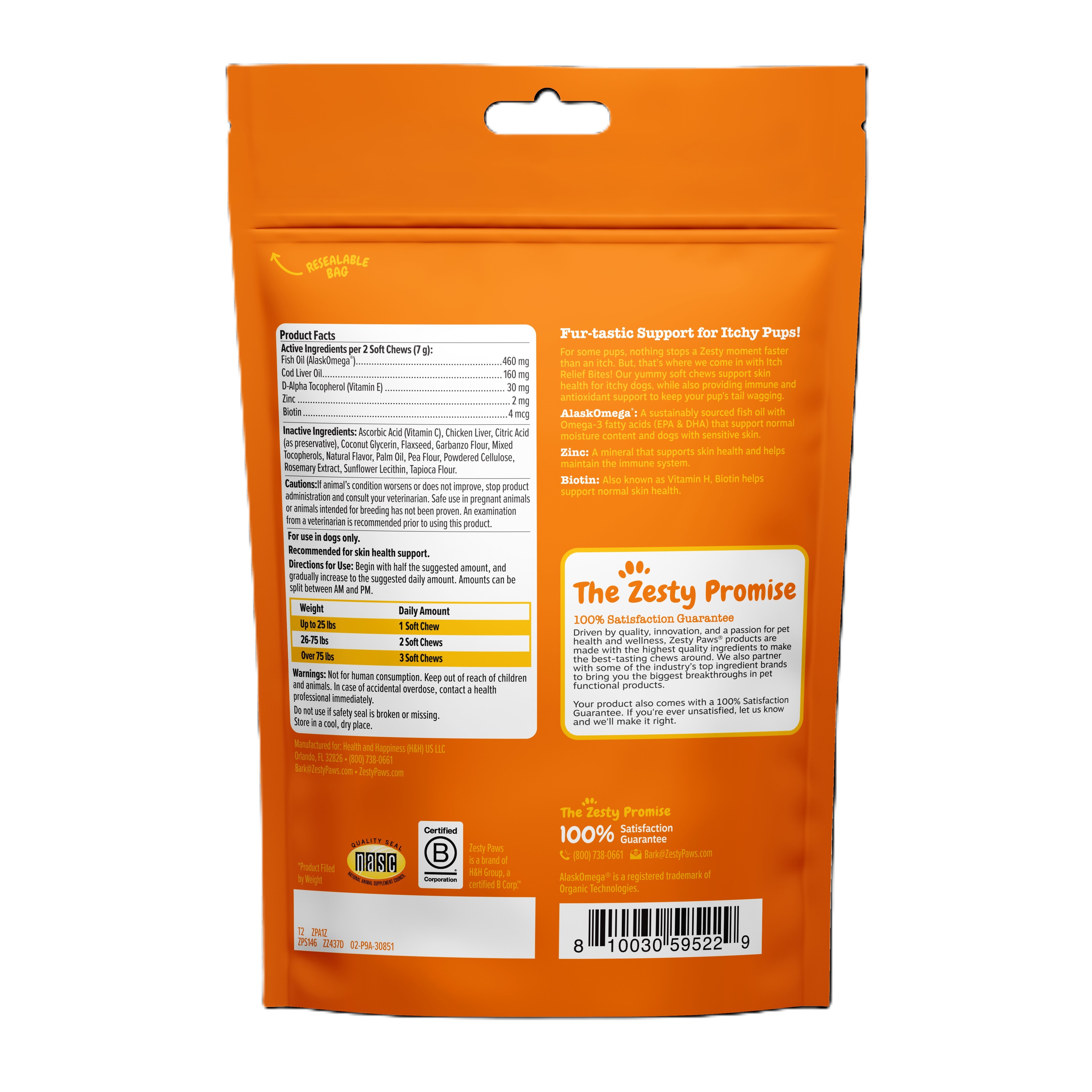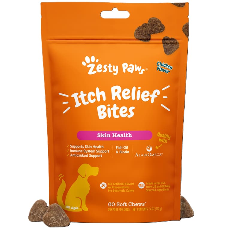 As a pet parent, nothing captures your heart more than seeing your dog living their Zestiest life. But for some pups, nothing stops a Zesty moment faster than an itch. So, it's only natural that you would feel sensitive about that! That's why it's important to find a chew that can provide your pup with pawsitive benefits for their skin health. But, that’s where Zesty Paws comes in with Itch Relief Bites! These yummy soft chews support skin health for itchy dogs, while also providing immune and antioxidant support to keep your pup’s tail wagging. Plus, these chews taste great! Trust us, we have a hot spot where our official four-legged testers tell us what's best. So, rest assured that these chicken flavored Itch Relief Bites will surely give your pup an itch for more, while you get to enjoy the daily relief of spoiling your dog with special treatment instead of giving them not-so fun anti-itch pills, tablets, capsules, creams, or sprays.Specifications