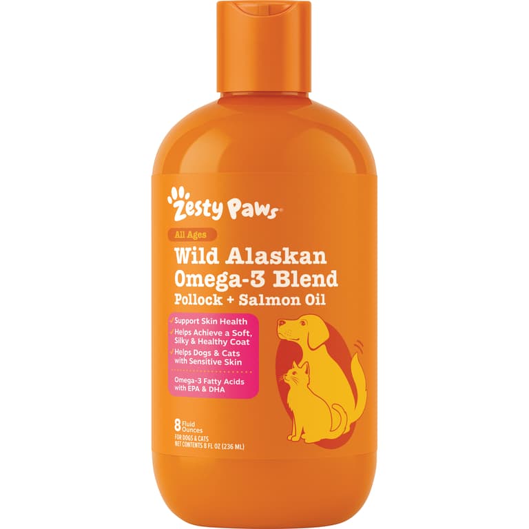 Nothing gets dogs and cats more excited than mealtime, so why not give your pet another mouthwatering reason to race to their food bowl with a paw-some fish oil with omegas? As a source of Omega-3 fatty acids (EPA and DHA), Zesty Paws mouthwatering Wild Alaskan Omega-3 Blend Pollock + Salmon Oil is a pawsome fish oil that provides support for skin health and a shiny looking coat to help canines and felines - large or small - look as great as they feel. Plus, we know your pet is anti bad flavors and that you want to treat them to something yummy. With Zesty Paws Wild Alaskan Omega-3 Blend Pollock + Salmon Oil, your pet will love the delicious taste. Trust us... we have a hot spot where only the most trusted four-legged testers tell us. So, expect Fido and his feline friend to get the itch for more! Now, you can let out a sigh of relief knowing that your pet will get the support they need to keep them feeling Zesty!Plus, we know your pet is anti bad flavors and that you want to treat them to something yummy. With Zesty Paws Wild Alaskan Omega-3 Blend Pollock + Salmon Oil, your pet will love the delicious taste. Trust us... we have a hot spot where only the most trusted four-legged testers tell us. So, expect Fido and his feline friend to get the itch for more! Now, you can let out a sigh of relief knowing that your pet will get the support they need to keep them feeling Zesty!Specifications