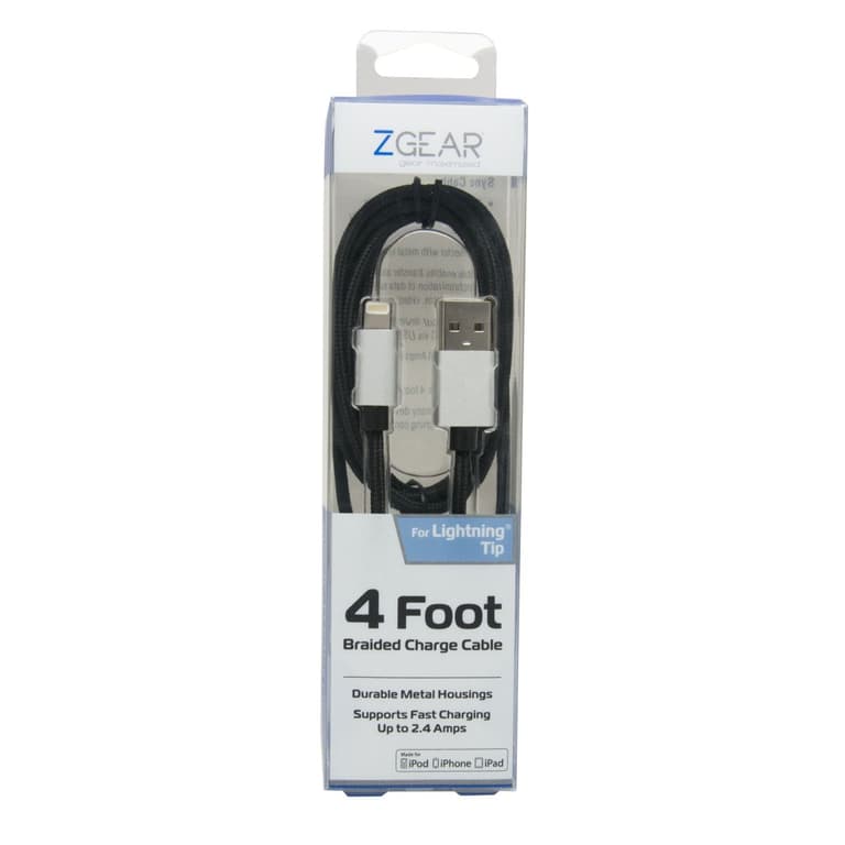 1 year limited warranty; 4 Braided Metal Tip Lightning Charge & 4 feet of cable; Case friendly slim tip; Charge personal devices from any USB port; Durable tangle resistant cable; Sync Cable - Black