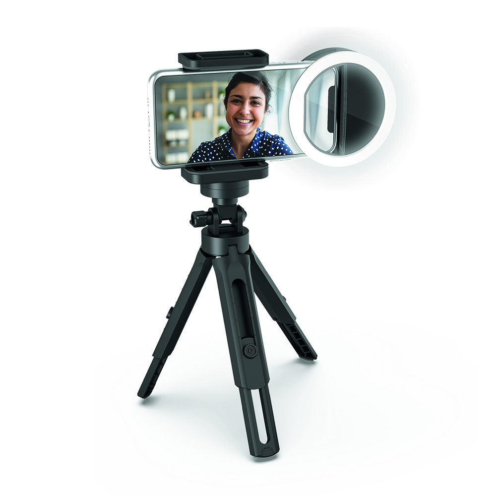 360 degree adjustable head mount; Capture photos or video from every angle; Clip-on selfie light; Fits devices up to 3.5" wide; Lightweight portable design; Mobile phone & camera holder; Supports landscape or portrait orientation; Tripod to handheld