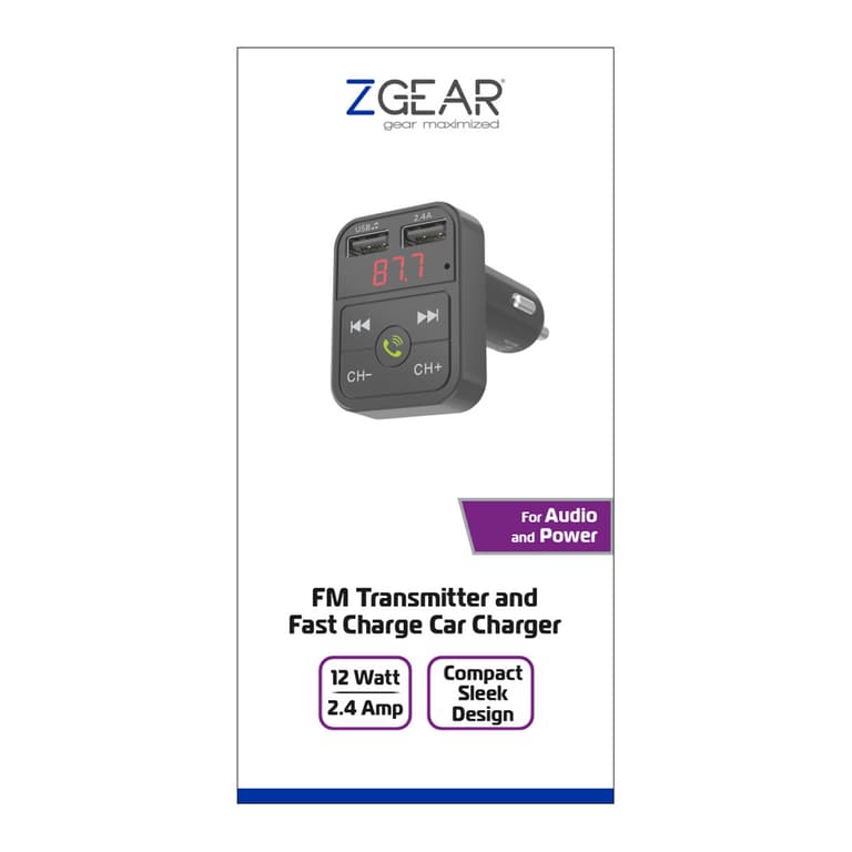 ZGEAR Wireless FM Transmitter with Adaptive Fast Charge Car Charger 2.4 A USB LCD - Drive smarter with the ZGEAR Wireless FM Transmitter and Adaptive Fast Charge Car Charger combo! This sleek, high-tech device lets you seamlessly stream your favorite music and hands-free calls through your car stereo with crystal-clear audio. Featuring Adaptive Fast Charging (2.4A USB), it powers up your devices quickly and efficiently on the go. The LCD screen displays important info at a glance, so you can track your connection, song, and charging status without distraction. Whether you're commuting, road-tripping, or running errands, stay connected, powered up, and entertained with the ZGEAR Wireless FM Transmitter!Specifications